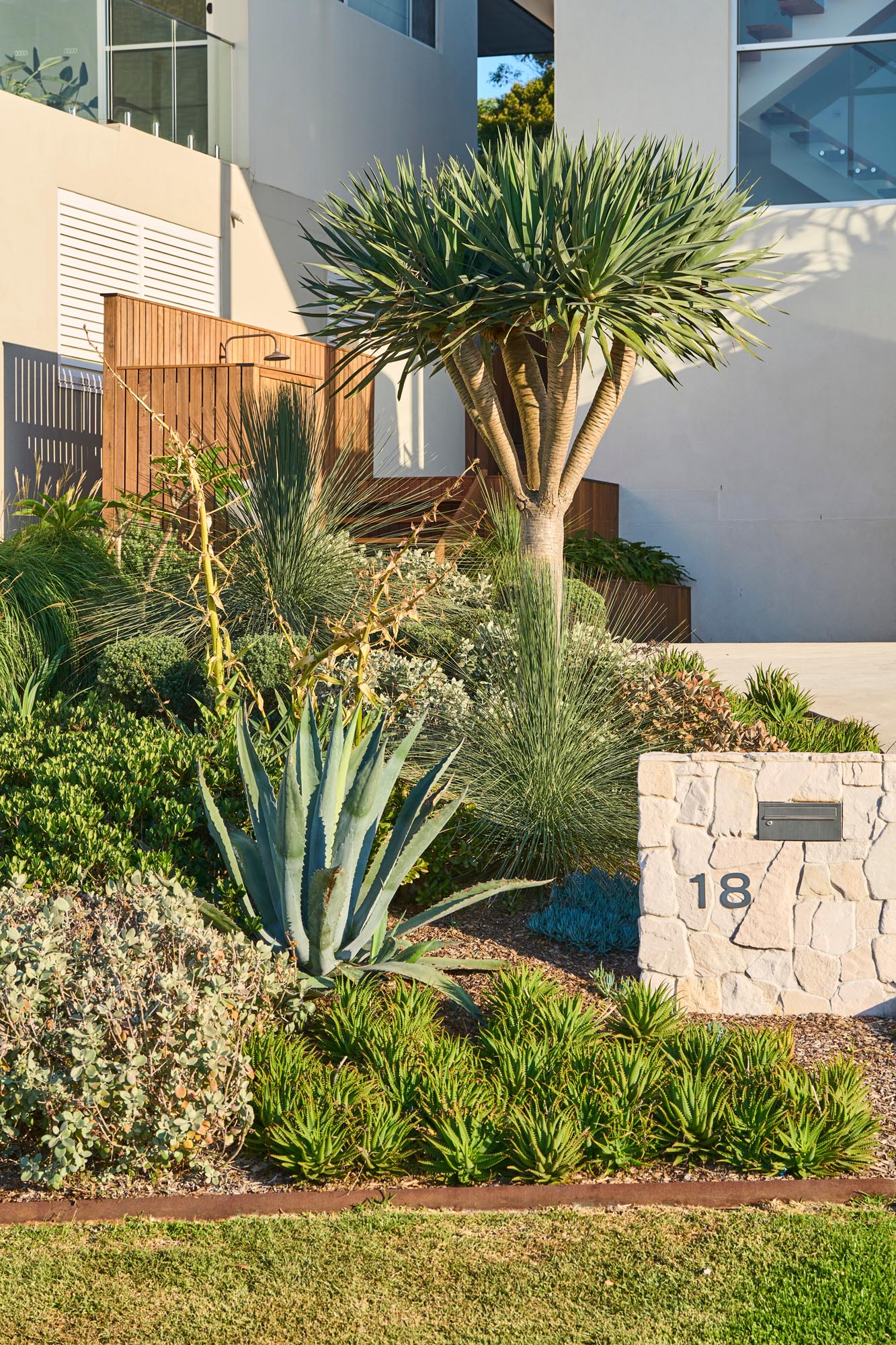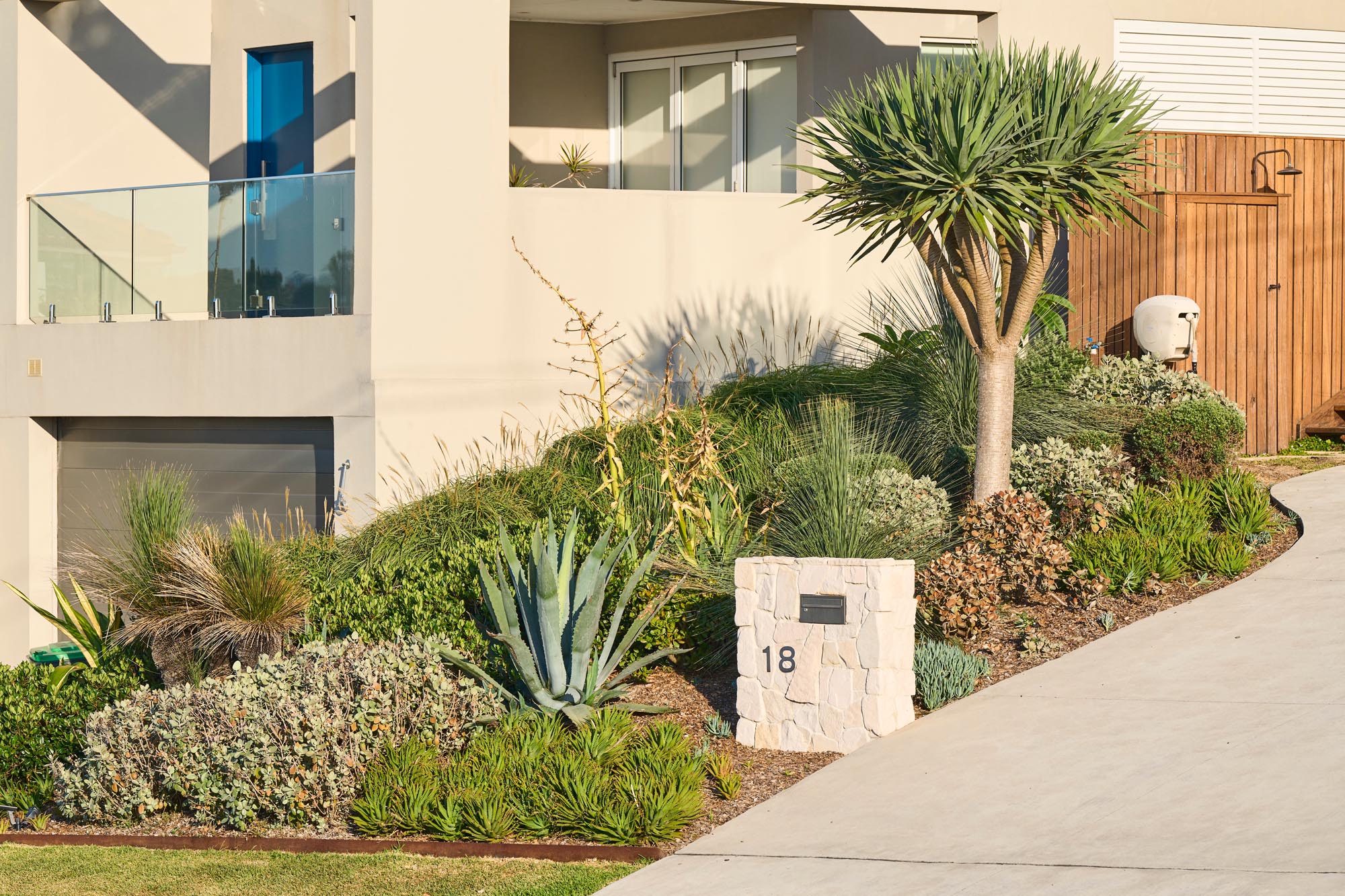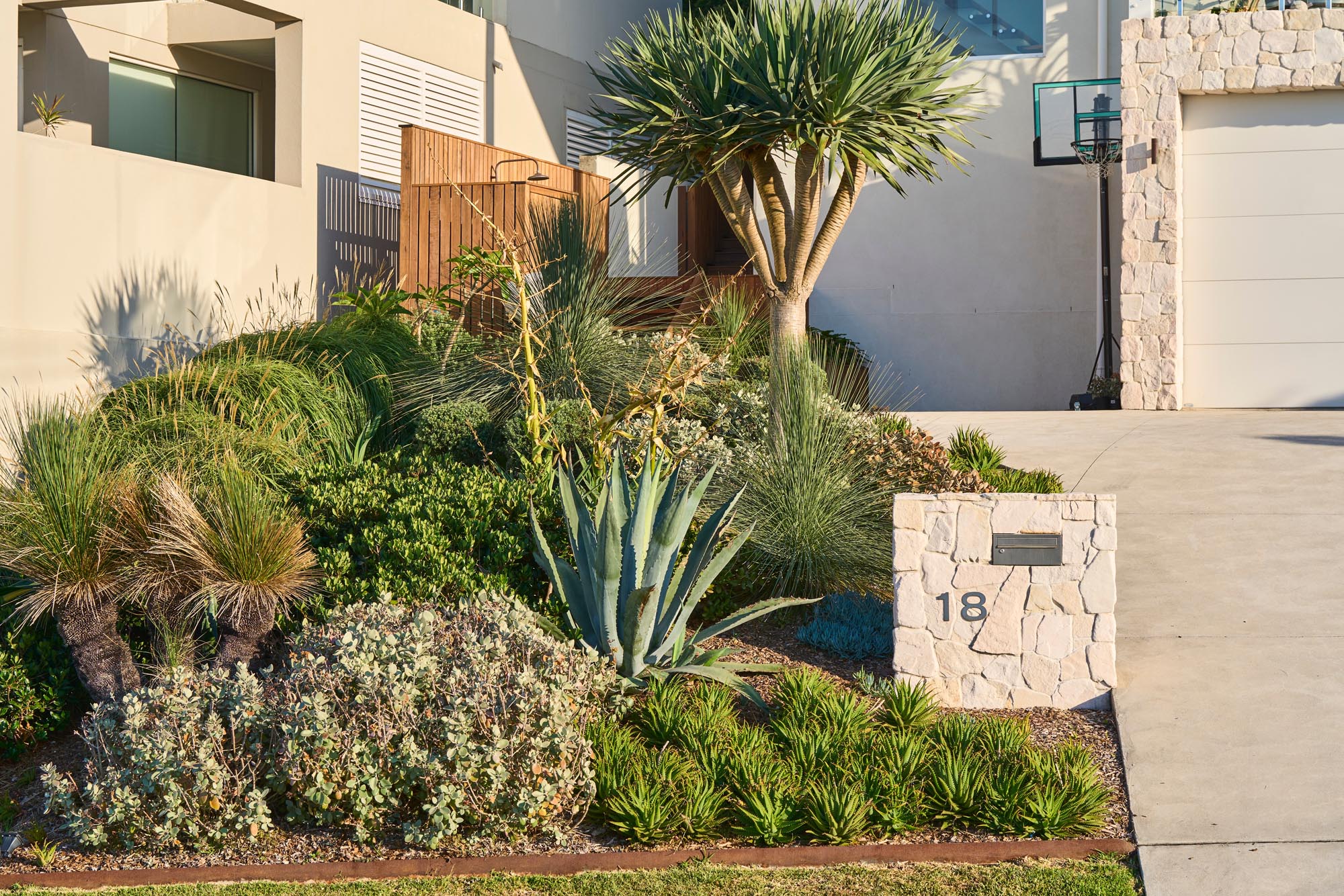 The Landscape surrounds a south-facing, modern contemporary residence with strong architectural lines and a clean, geometric aesthetic. The Design complements the architecture through structural plantings, minimalist materials and a meticulously curated layout that emphasises both form and function.